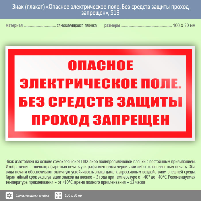 Знак (плакат) «Опасное электрическое поле. Без средств защиты проход запрещен», S13 (пленка, 100х50 мм) в Волгограде купить