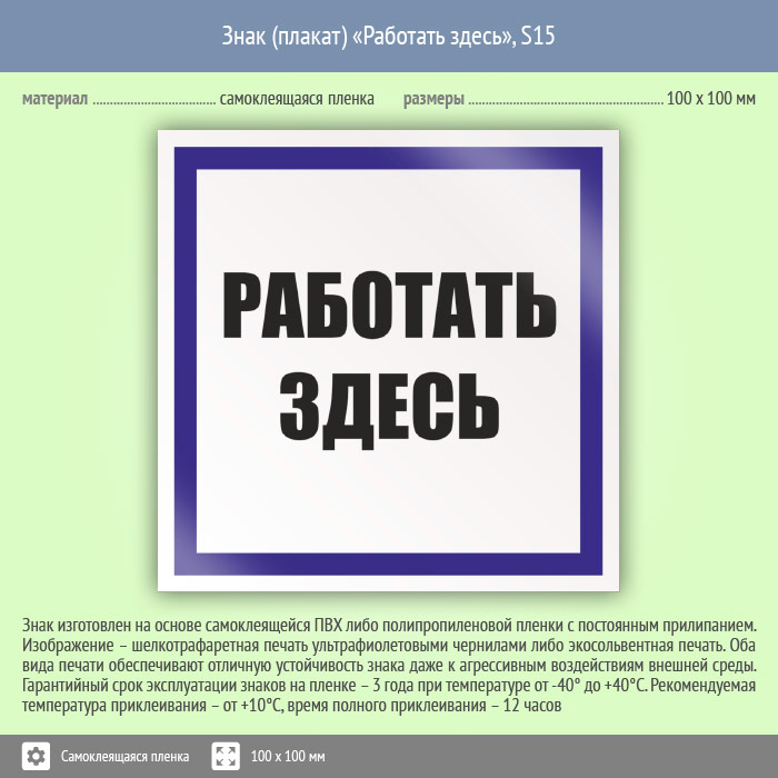 Знак (плакат) «Работать здесь», S15 (пленка, 100х100 мм) в Волгограде купить
