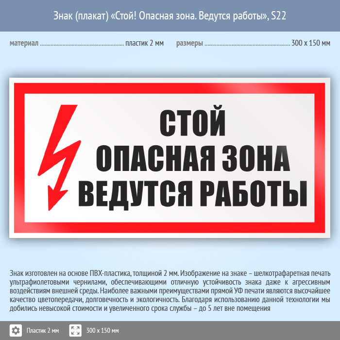 Знак (плакат) «Стой! Опасная зона. Ведутся работы», S22 (пластик, 300х150 мм) в Волгограде купить