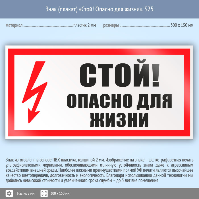 Знак (плакат) «Стой! Опасно для жизни», S25 (пластик, 300х150 мм) в Волгограде купить