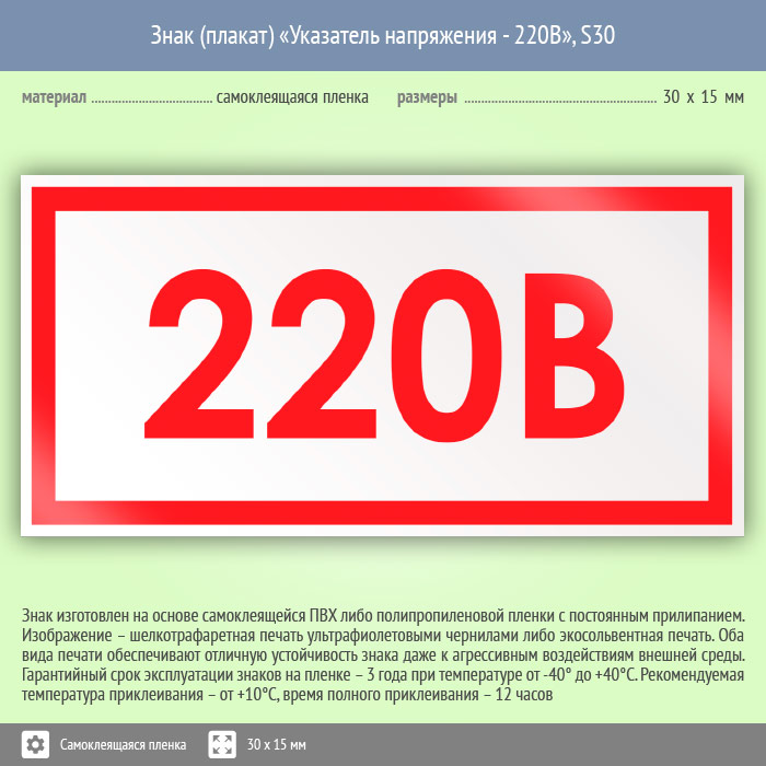Знак (плакат) «Указатель напряжения - 220В», S30 (50 штук, пленка, 30х15 мм) в Волгограде купить