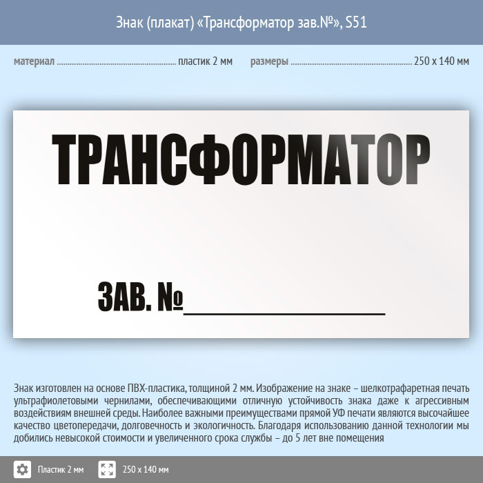 Знак (плакат) «Трансформатор зав.№», S51 (пластик, 250х140 мм) в Волгограде купить