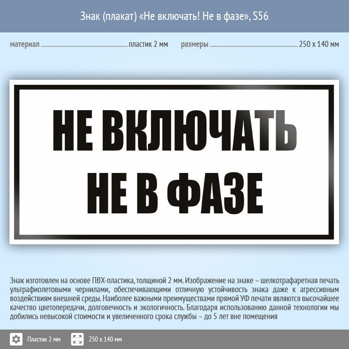 Знак (плакат) «Не включать! Не в фазе», S56 (пластик, 250х140 мм) в Волгограде купить