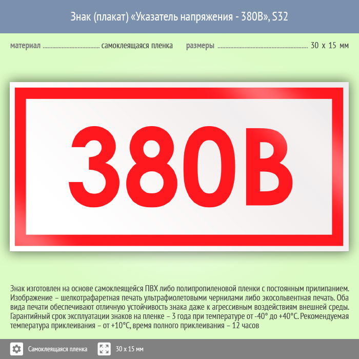 Знак (плакат) «Указатель напряжения - 380В», S32 (50 штук, пленка, 30х15 мм) в Волгограде купить