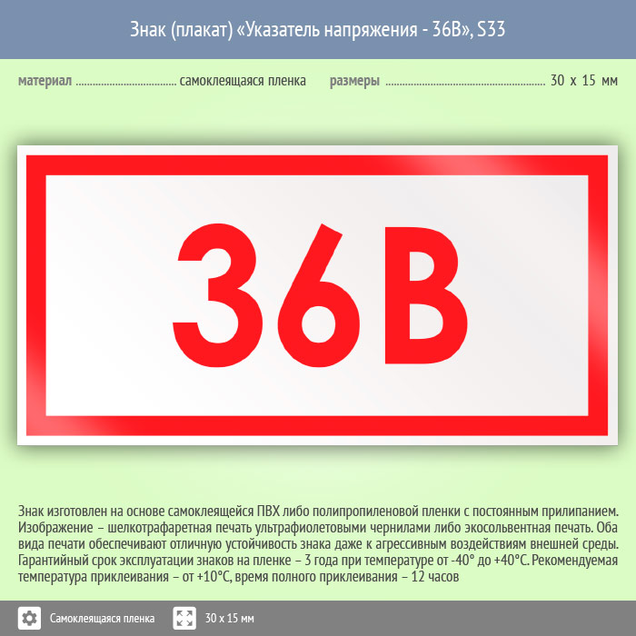 Знак (плакат) «Указатель напряжения - 36В», S33 (50 штук, пленка, 30х15 мм) в Волгограде купить