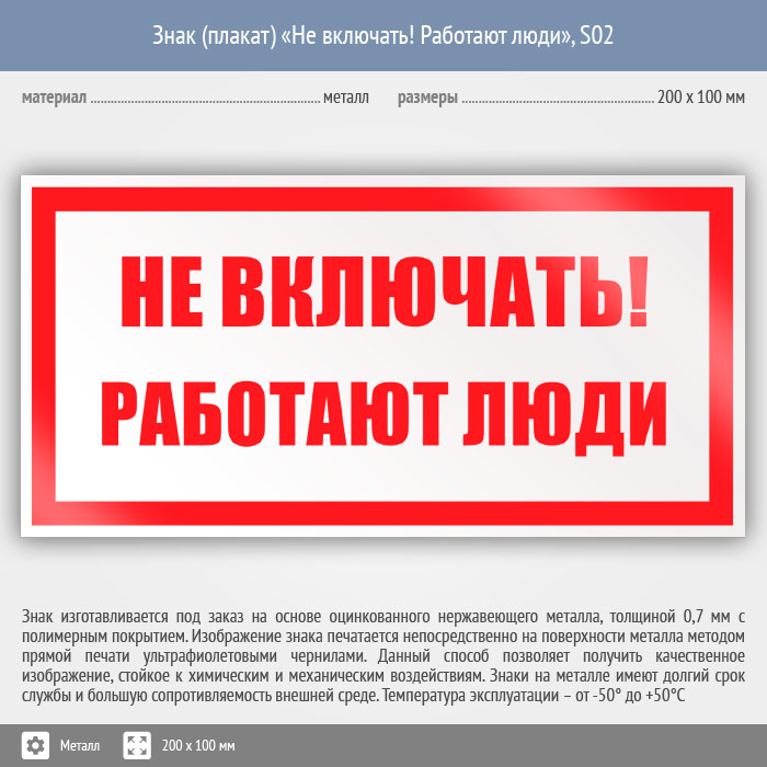 Знак (плакат) «Не включать! Работают люди», S02 (металл, 200х100 мм) в Волгограде купить