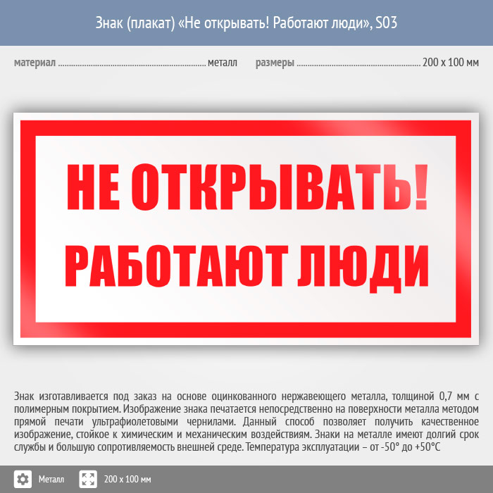 Знак (плакат) «Не открывать! Работают люди», S03 (металл, 200х100 мм) в Волгограде купить