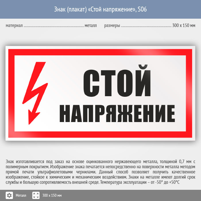 Знак (плакат) «Стой напряжение», S06 (металл, 300х150 мм) в Волгограде купить
