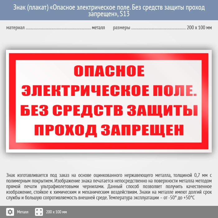 Знак (плакат) «Опасное электрическое поле. Без средств защиты проход запрещен», S13 (металл, 200х100 мм) в Волгограде купить