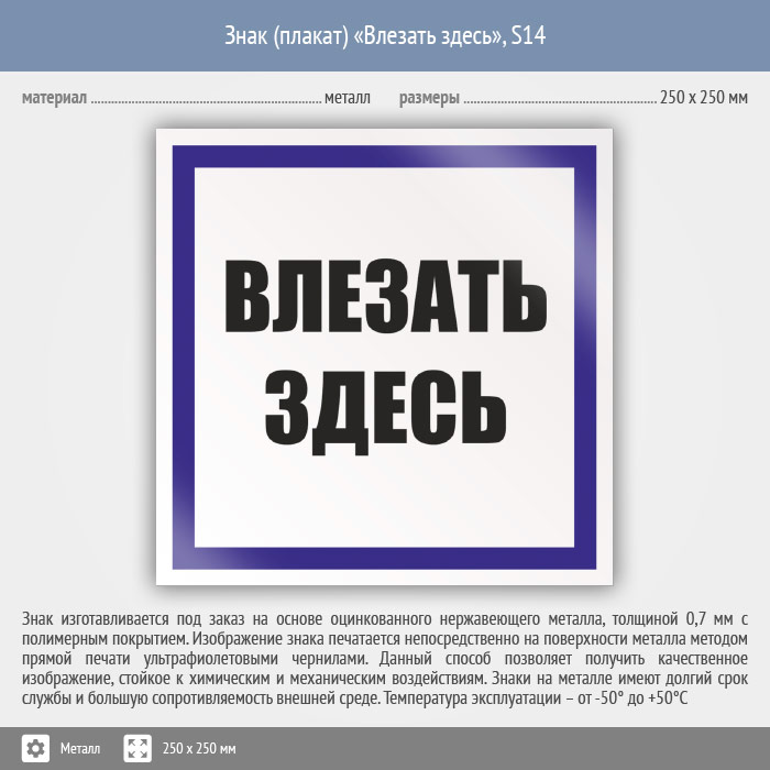 Знак (плакат) «Влезать здесь», S14 (металл, 250х250 мм) в Волгограде купить