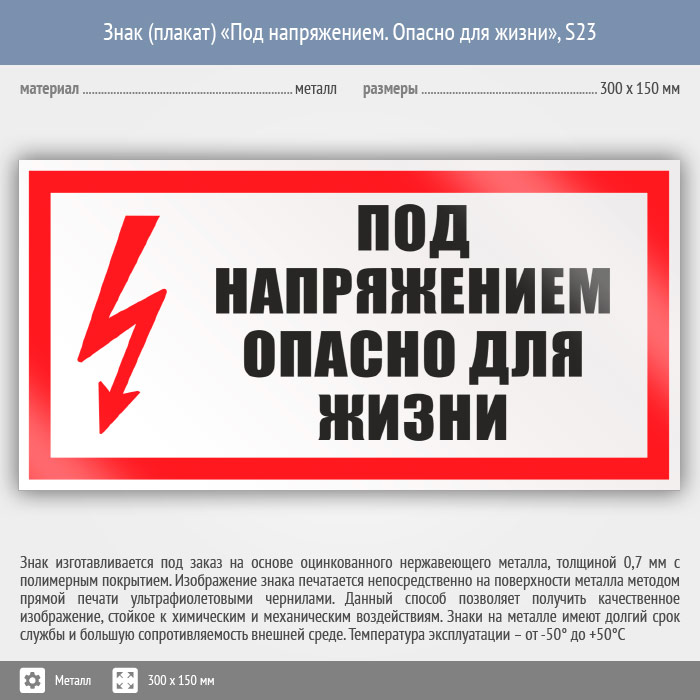 Знак (плакат) «Под напряжением. Опасно для жизни», S23 (металл, 300х150 мм) в Волгограде купить