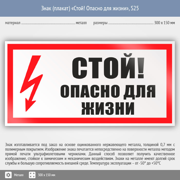 Знак (плакат) «Стой! Опасно для жизни», S25 (металл, 300х150 мм) в Волгограде купить