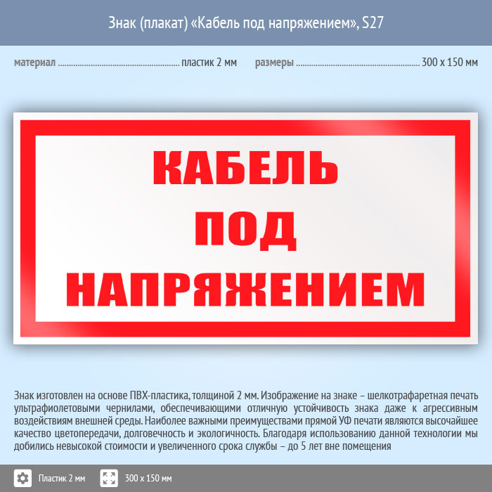 Знак (плакат) «Кабель под напряжением», S27 (пластик, 300х150 мм) в Волгограде купить