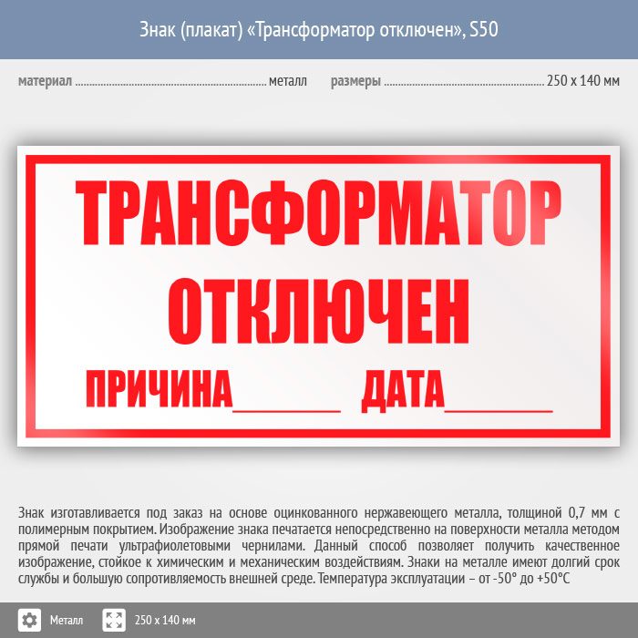 Знак (плакат) «Трансформатор отключен», S50 (металл, 250х140 мм) в Волгограде купить