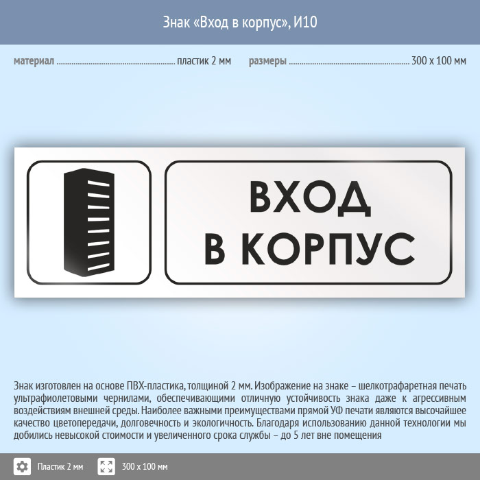 Знак «Вход в корпус», И10 (пластик, 300х100 мм) в Волгограде купить