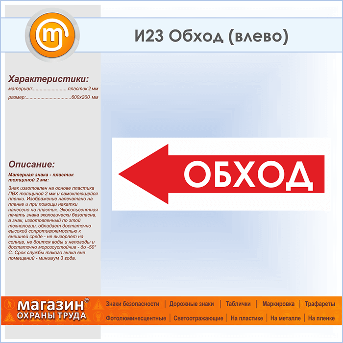 Знак «Обход (влево)», И23 (пластик, 600х200 мм) в Волгограде купить