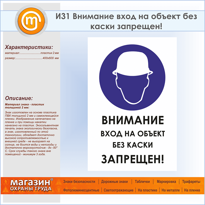 Знак «Внимание вход на объект без каски запрещен!», И31 (пластик, 400х600 мм) в Волгограде купить
