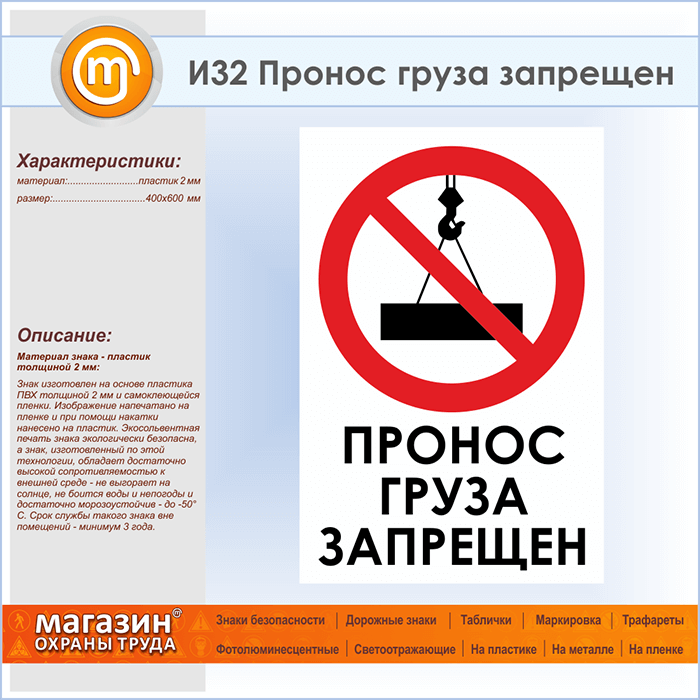 Знак «Пронос груза запрещен», И32 (пластик, 400х600 мм) в Волгограде купить