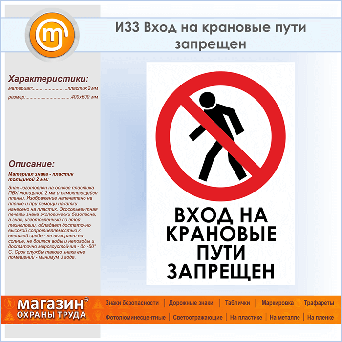 Знак «Вход на крановые пути запрещен», И33 (пластик, 400х600 мм) в Волгограде купить