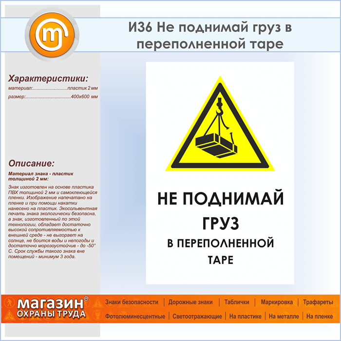 Знак «Не поднимай груз в переполненной таре», И36 (пластик, 400х600 мм) в Волгограде купить