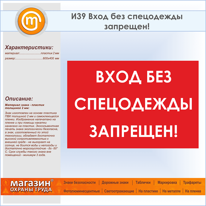 Знак «Вход без спецодежды запрещен!», И39 (пластик, 600х400 мм) в Волгограде купить
