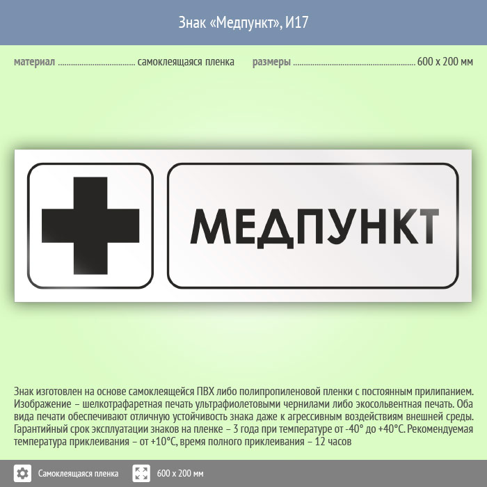 Знак «Медпункт», И17 (пленка, 600х200 мм) в Волгограде купить