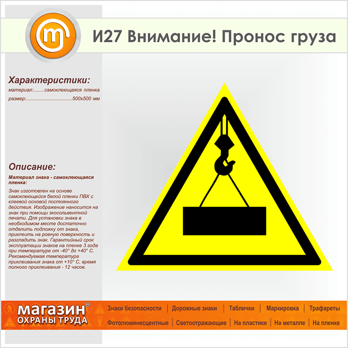Знак «Внимание! Пронос груза», И27 (пленка, сторона 500 мм) в Волгограде купить