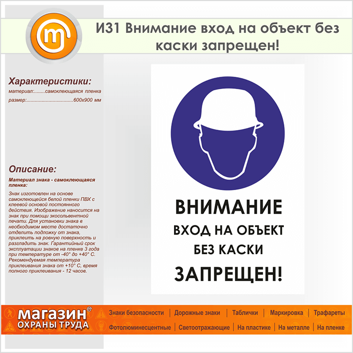 Знак «Внимание вход на объект без каски запрещен!», И31 (пленка, 600х900 мм) в Волгограде купить