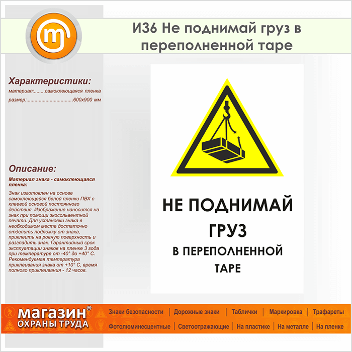 Знак «Не поднимай груз в переполненной таре», И36 (пленка, 600х900 мм) в Волгограде купить
