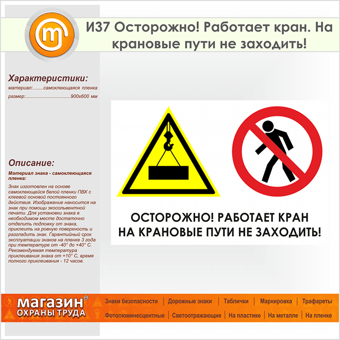 Знак «Осторожно! Работает кран. На крановые пути не заходить!», И37 (пленка, 900х600 мм) в Волгограде купить