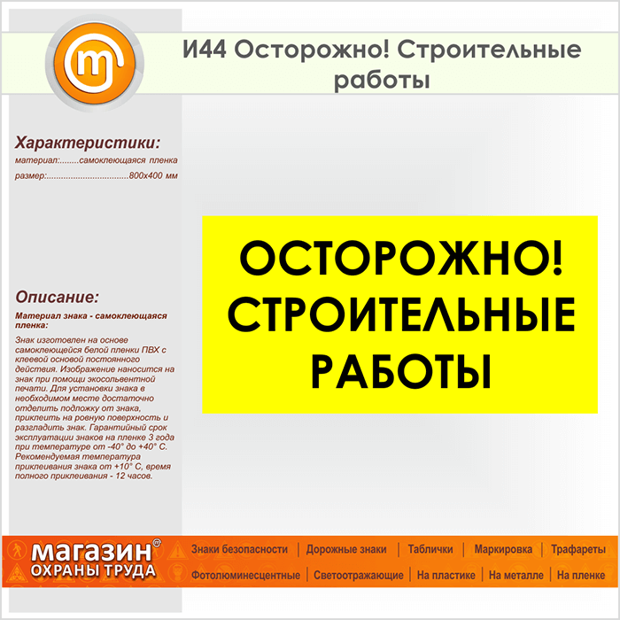 Знак «Осторожно! Строительные работы», И44 (пленка, 800х400 мм) в Волгограде купить