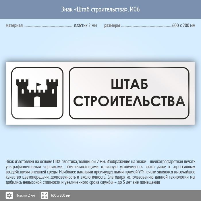 Знак «Штаб строительства», И06 (пластик, 600х200 мм) в Волгограде купить