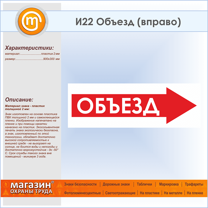 Знак «Объезд (вправо)», И22 (пластик, 900х300 мм) в Волгограде купить