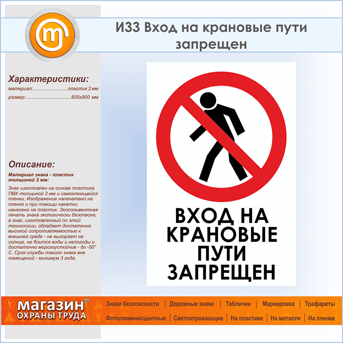 Знак «Вход на крановые пути запрещен», И33 (пластик, 600х900 мм) в Волгограде купить