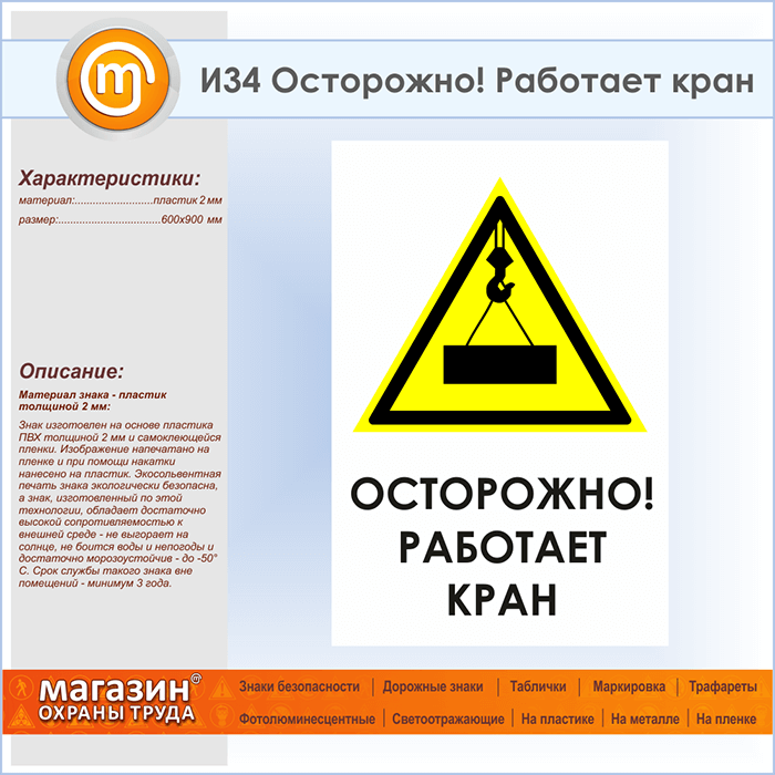 Знак «Осторожно! Работает кран», И34 (пластик, 600х900 мм) в Волгограде купить