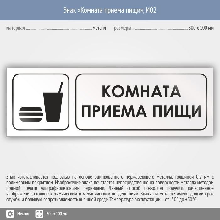 Знак «Комната приема пищи», И02 (металл, 300х100 мм) в Волгограде купить