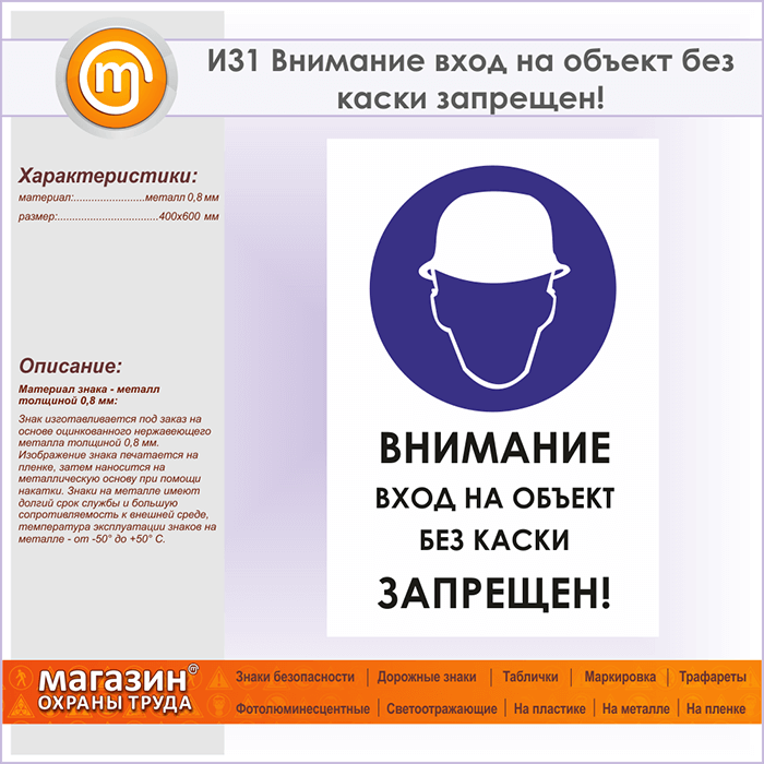 Знак «Внимание вход на объект без каски запрещен!», И31 (металл, 400х600 мм) в Волгограде купить