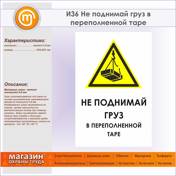 Знак «Не поднимай груз в переполненной таре», И36 (металл, 600х900 мм) в Волгограде купить