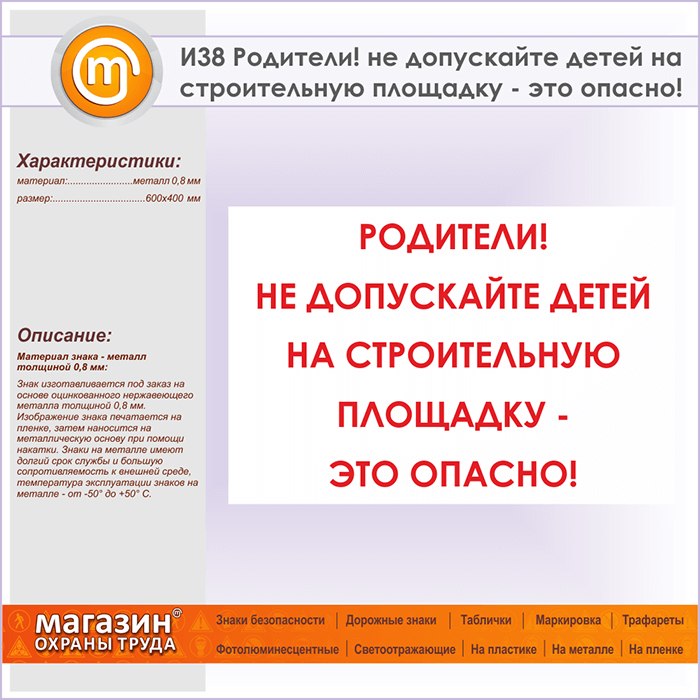 Знак «Родители! не допускайте детей на строительную площадку - это опасно!», И38 (металл, 600х400 мм) в Волгограде купить