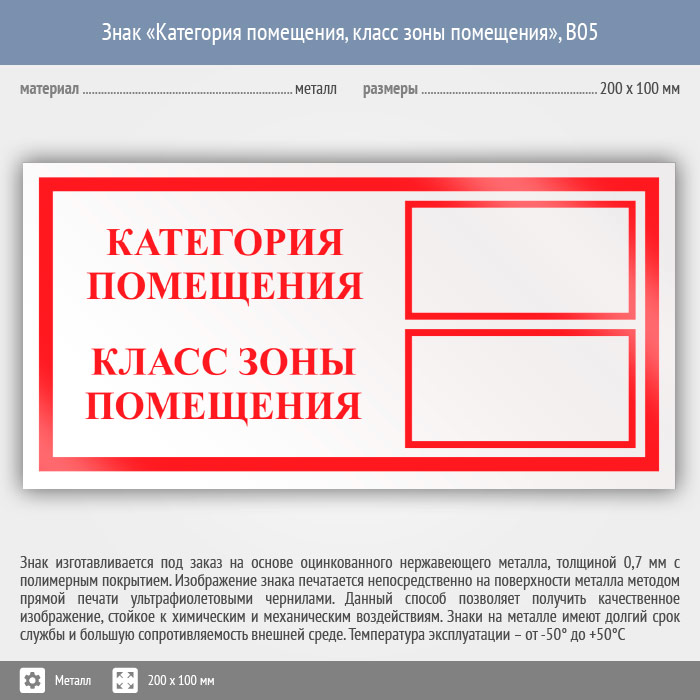 Знак «Категория помещения, класс зоны помещения», B05 (металл, 200х100 мм) в Волгограде купить