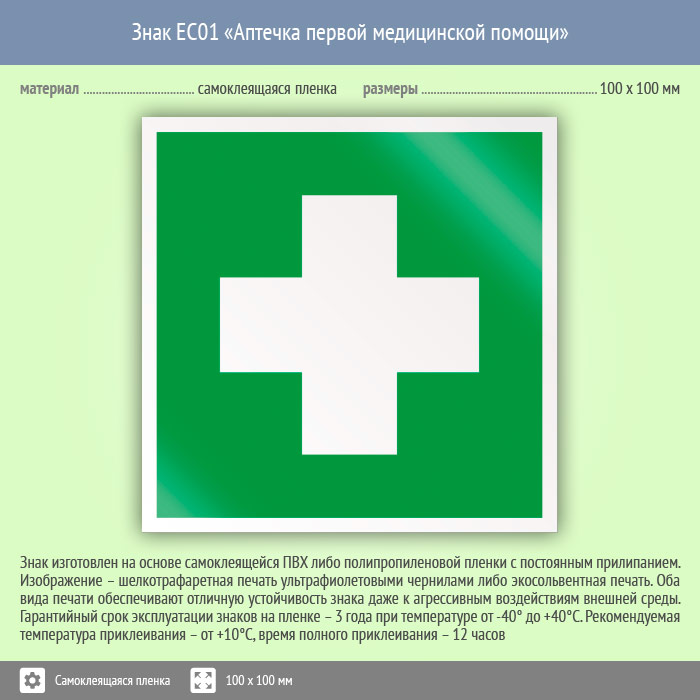 Знак EC01 «Аптечка первой медицинской помощи» (пленка, 100х100 мм) в Волгограде купить