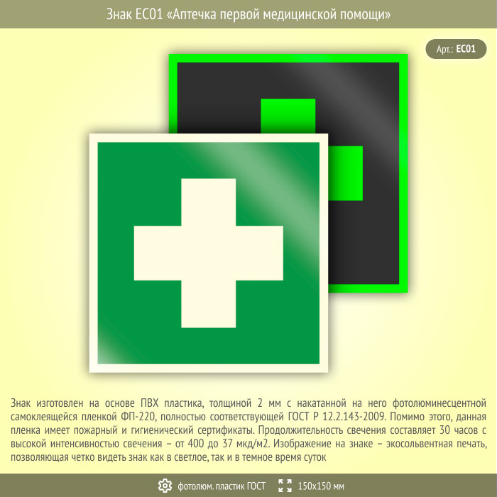 Знак EC01 «Аптечка первой медицинской помощи» (фотолюминесцентный пластик ГОСТ 34428-2018, 150х150 мм) в Волгограде купить