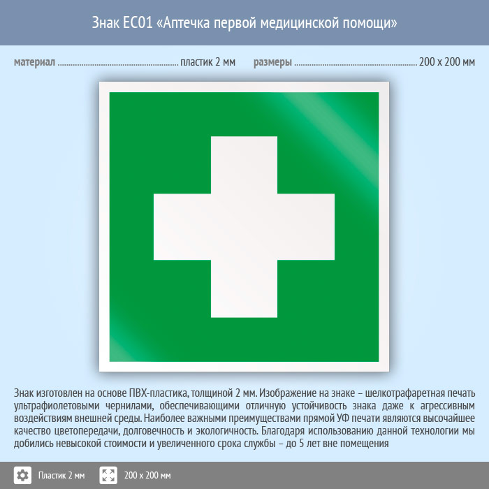 Знак EC01 «Аптечка первой медицинской помощи» (пластик, 200х200 мм) в Волгограде купить