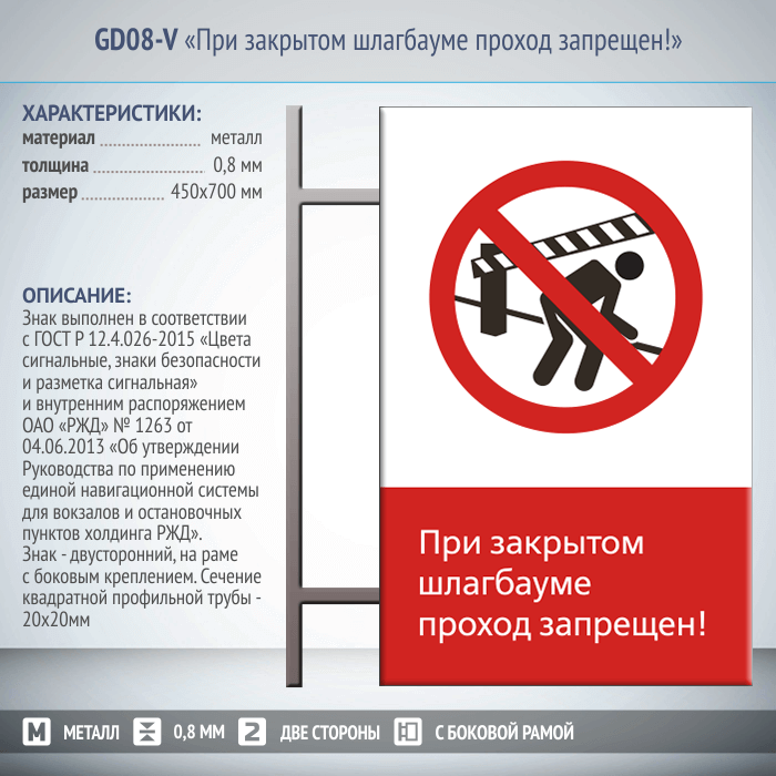 Знак «При закрытом шлагбауме проход запрещен!», GD08-V (двусторонний вертикальный, 450х700 мм, металл, на раме с боковым креплением) в Волгограде купить