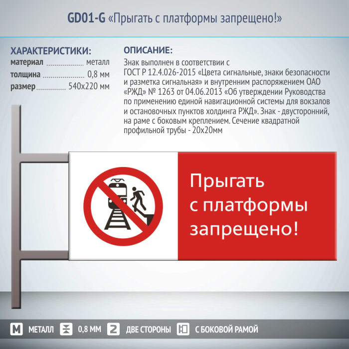 Знак «Прыгать с платформы запрещено!», GD01-G (двусторонний горизонтальный, 540х220 мм, металл, на раме с боковым креплением) в Волгограде купить