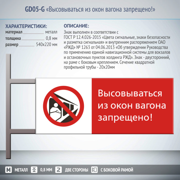 Знак «Высовываться из окон вагона запрещено!», GD05-G (двусторонний горизонтальный, 540х220 мм, металл, на раме с боковым креплением) в Волгограде купить