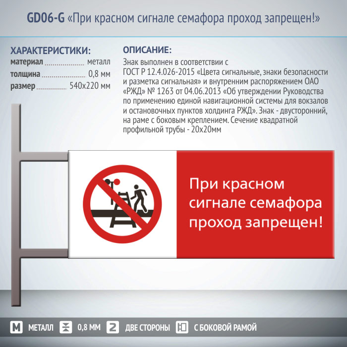 Знак «При красном сигнале семафора проход запрещен!», GD06-G (двусторонний горизонтальный, 540х220 мм, металл, на раме с боковым креплением) в Волгограде купить