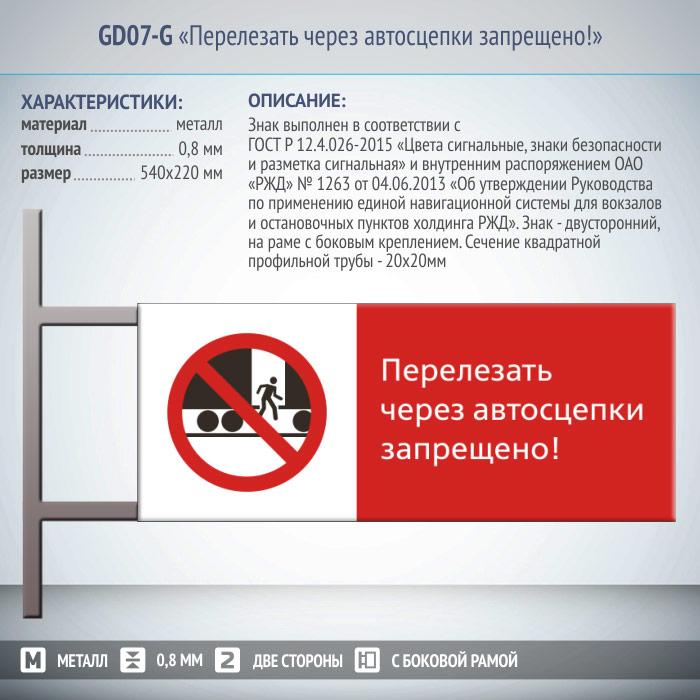 Знак «Перелезать через автосцепки запрещено!», GD07-G (двусторонний горизонтальный, 540х220 мм, металл, на раме с боковым креплением) в Волгограде купить