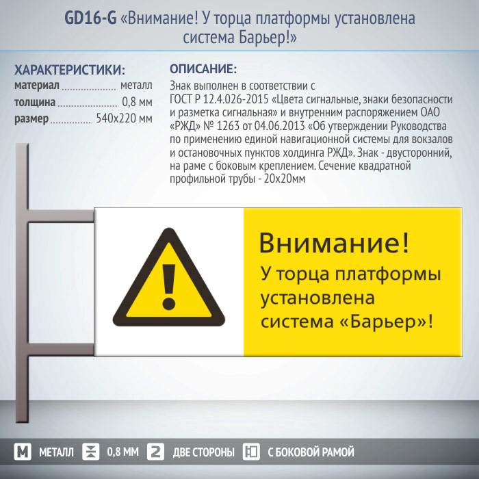 Знак «Внимание! У торца платформы установлена система Барьер!», GD16-G (двусторонний горизонтальный, 540х220 мм, металл, на раме с боковым креплением) в Волгограде купить