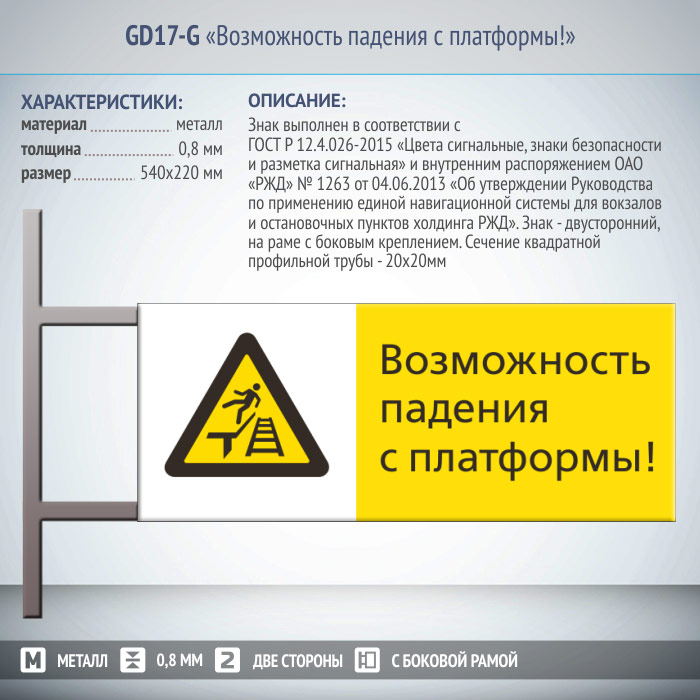 Знак «Возможность падения с платформы!», GD17-G (двусторонний горизонтальный, 540х220 мм, металл, на раме с боковым креплением) в Волгограде купить